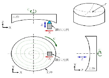 當非軸對稱非球面形狀之加工點在XY平面的座標為 (x, y)時,可由方程式計算得到相對應之Z軸座標位置。進行非軸對稱非球面加工時,可藉由控制加工機之X軸(移動)和C軸(旋轉)將刀具移動至加工點 (x, y)時,輸入由計算得知的非軸對稱組成數據控制快刀伺服裝置作動。這種驅動方式,因快刀可進行高速控制,可避免加工機整體因慣性大造成加工速率低的問題。另外,因現有的桌上型超精密加工機的進刀解析度僅0.1 m,藉由所開發之快刀的解析度能達0.002 m,進而能提升非軸對稱成分修正解析度。